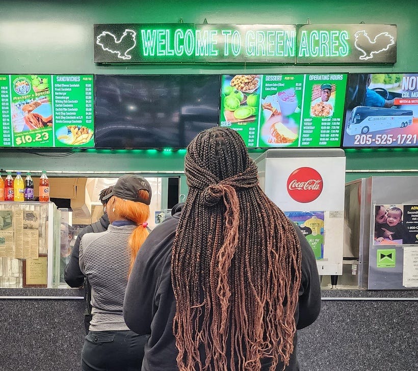 We decided we were ready for lunch, and he walked us to a place called Green Acres. The place had a line out the door, and once in, you ordered your food to go at the counter. It smelled fucking incredible.